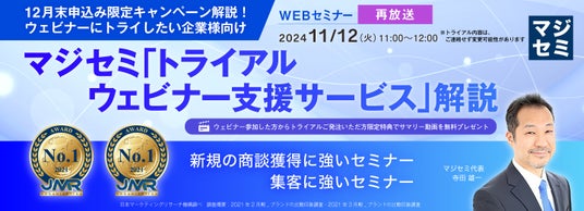 マジセミ株式会社は「【再放送】【12月末申込み限定キャンペーン解説!ウェビナーにトライしたい企業様向け】」というテーマのウェビナーを開催します。