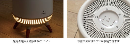 本体下部の吹出口には暖色系LEDライトを搭載。暖かい光が360°広がり、足元を照らします。