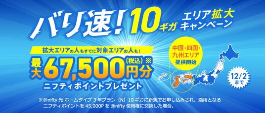 ニフティ、「バリ速!10ギガエリア拡大キャンペーン」を実施~西日本提供エリア拡大を記念して「@nifty光 10ギガ」の新規申込で最大67,500円分(税込)のニフティポイントをプレゼント~