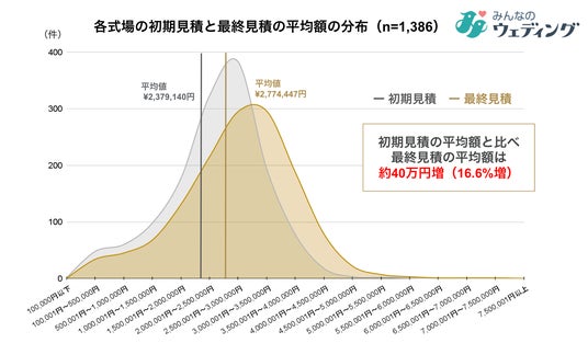 結婚式を挙げる多くのカップルにとって、初期見積から最終見積への費用増加は大きな悩みとなっています。2007年11月1日~2024年9月30日に「みんなのウェディング」に投稿された各式場の初期見積と最終見積の平均金額を分析した結果※2、式場全体で初期見積の平均は約238万円、最終見積の平均は約277万円となり、約40万円の追加費用が発生していることがわかりました。割合にして16.6%の費用増加になります。