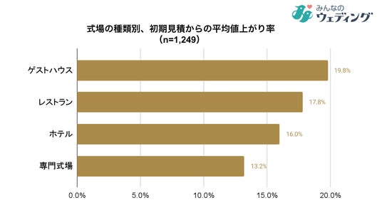 結婚式場(n=1249 ※3)の種類別値上がり率では、「ゲストハウス」19.8%が最も高く、次いで「レストラン」17.8%、「ホテル」16.0%、「専門式場」13.2%となっています。