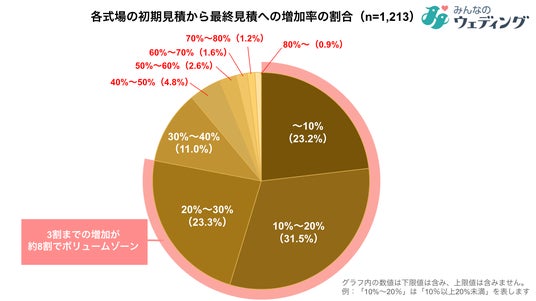 この増加の背景には初期見積には含まれていなかったオプションの追加、衣装や料理のグレードアップなど様々な要因が考えられますが、カップルは追加費用が発生する可能性を事前に考慮し予算を組み立てる必要があることがうかがえます。