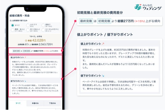 株式会社くふうウェディング(くふうカンパニーグループ)は、ウェディング総合情報サイト「みんなのウェディング」に、初期見積と最終見積の平均差分を閲覧できる「見積ギャップレポ」機能を追加しました。