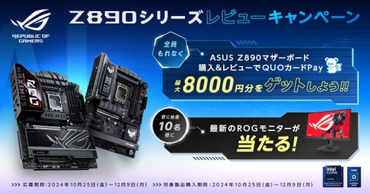 ASUS JAPAN株式会社は、Z890シリーズマザーボードの購入&レビューで、応募者全員にQUOカードPay 最大8,000円分、抽選で10名様にROG STRIX XG259CSが当たるキャンペーンを2024年10月25日(金)より開催します。