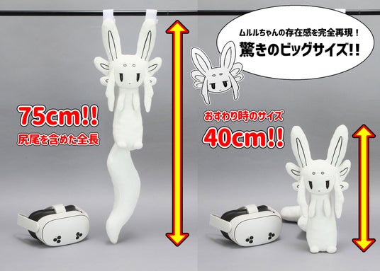 VR上では常に浮遊しており、また尻尾が胴体と同じくらいの大きさがある特徴的なデザインを、勇夢将士の造形・アバター原作者のくろむ監修のもとに立体化。VR上での印象をそのままに、耳から足先まで40cm、尻尾を含めると75cmというビッグサイズのぬいぐるみに仕上げました。