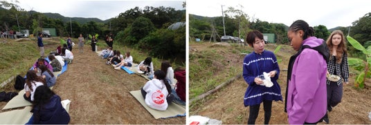 suzusanスタッフの皆さんによる英語でのレクチャーの後、染め物の柄を作るため素材となる石や木の実を拾いに庭を散策。