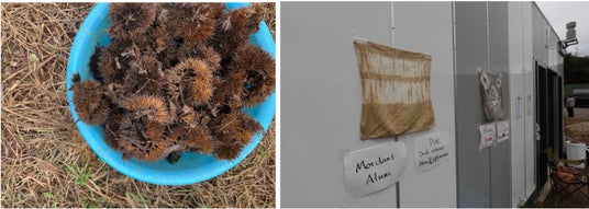 有松染ブランド「suzusan」による出張ワークショップとして、CORRUGATED HOUSEの庭で収穫した栗から作った染料を使って、2色のオリジナルハンカチを制作。