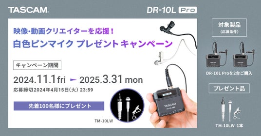 TASCAM(タスカム)は、映画、ドラマ、結婚式、YouTube、Vlogなどの「声」をクリアに収録ができる、32ビットフロート対応ピンマイク付き小型オーディオレコーダー TASCAM『DR-10L Pro』を2台ご購入いただいた先着100名様を対象に、白色ピンマイク『TM-10LW』がもらえる『映像・動画クリエイターを応援!映画、ドラマ、結婚式、YouTube、Vlogなどの「声」をクリアに収録する白色ピンマイク プレゼントキャンペーン』を実施いたします。