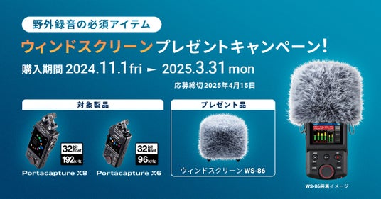 キャンペーン期間中に、『Portacapture X8』または『Portacapture X6』をご購入後、特設サイトよりご応募いただいたお客様全員に、立体形状で防風効果の高いファーを採用しウィンドノイズを低減するウィンドスクリーン『WS-86』をプレゼントいたします。