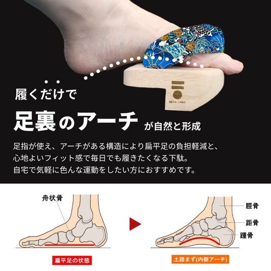 下駄という日本の伝統的な履物に現代科学の視点を取り入れた「バランス下駄」は、歩行時の姿勢や体幹を支える効果が期待されるプロダクトです。健康促進を目的に、感覚とエビデンスを融合させたデザインと構造に改良を加え、誰もが自分らしい歩行を楽しみながら、身体的な健康を維持できるようサポートしています。GETA LABOは、単なる履物としての枠を超え、日々の生活の中で活用できるツールとして、多くの方々に親しまれています。