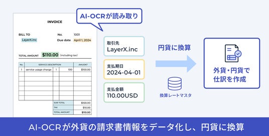 支払申請をご利用の場合だけでなく、バクラク請求書受取のみご利用されている場合でも、取り込んだ請求書の通貨・外貨金額をAI-OCRで読み取り、仕訳作成を行えます。