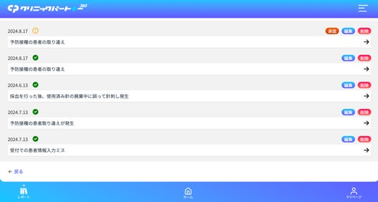 レポートの報告後、管理者にはレポートが表示され、承認後にスタッフに共有されます。インシデントレポート以外に、針刺し/切創など血液・体液汚染レポート、皮膚粘膜曝露レポート、クレームレポートがご使用いただけます