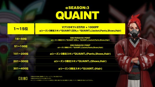 現在、αシーズン3「QUAINT」を開催しており、日本をテーマにした新MAP「MIYAKO」や新ブランド「DAFIRON」等の新コンテンツや魅力的なアップデートを毎週行っています。