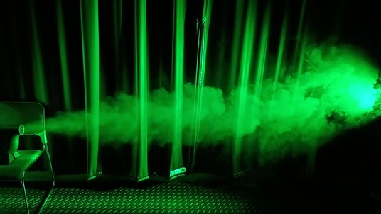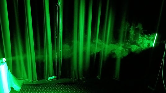 ▲本体(左)から放出させた煙にLEDをあてたもの<自社検証>