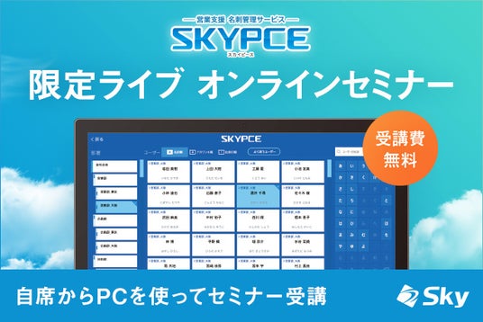 Sky株式会社では、名刺管理の「SKYPCE」で実現する名刺管理とその活用についてご紹介する「SKYPCE 限定ライブ オンラインセミナー」(受講費無料)を随時開催しています。