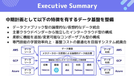 塚本氏は中期計画として、「データファブリック型の論理的な/仮想的なデータ統合」「主要クラウドベンダーから独立したインタークラウド型の構成」「柔軟に機能を追加/変更可能なコンポーザブル型の構成」「専門技能の学習効率向上・基盤コストの最適化を目指すシステム統廃合データ基盤を整備」の4つのコンセプトでデータ基盤を整備すると説明しました。「データファブリック型」は1つのシステムにデータを集約せずにメタデータのみを一元管理し、論理的なデータ統合を進めること、「インタークラウド型」はサービス側がAWS/GCP/Azureのどのクラウド環境を利用する場合でも、連携して利用できるデータ基盤に整備することです。「コンポーザブル型」の視点では、特定のクラウドサービスや独立系ソフトウェアで統一せずに、必要な機能分のサービスを導入することで切り替えを可能な限り容易にします。そして、データ基盤として利用するサービスを必要最低限にし、コストの削減および認知負荷の軽減を行うといいます。