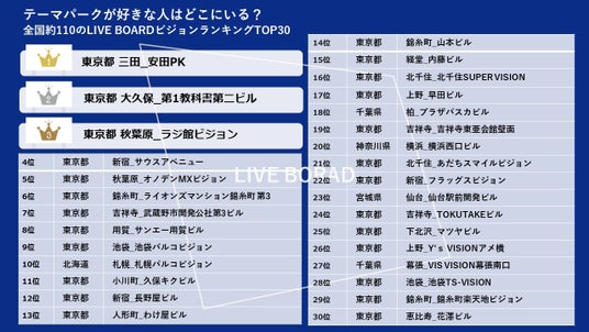 “テーマパークが好きな人”はどこにいる?全国のLIVE BOARD屋外ビジョンランキングTOP30を発表
