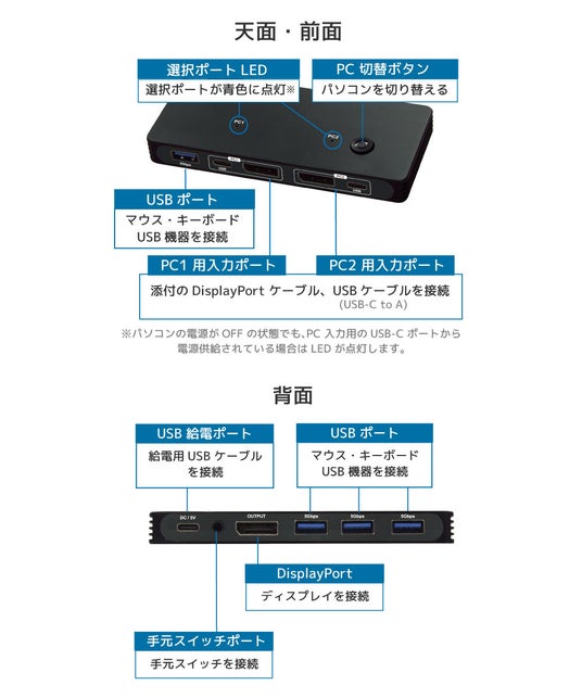 - キーボード・ディスプレイ・マウスを2台のパソコンで切り替えて快適操作