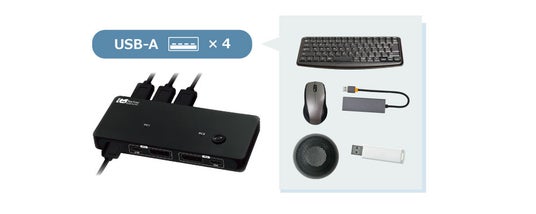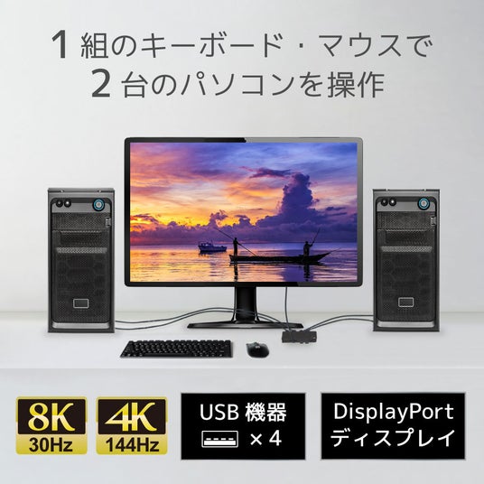 RS-260DP-8Kは「キーボード」「マウス」「ディスプレイ」「USBデバイス2台」を2台のパソコンで切り替えて操作することができます。