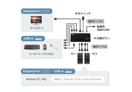 本製品はDisplayPort端子とUSB端子が搭載されたパソコンに対応。OSはWindowsとMacに対応しており、異なるOSのパソコン2台(WindowsとMac)でも切り替え可能です。