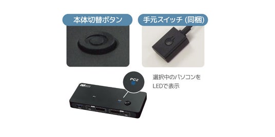切替方法は、本体ボタンもしくは手元スイッチ(同梱)を押すだけ。それぞれのパソコンに周辺機器を用意する必要がなく、より広々とした操作環境が実現できます。