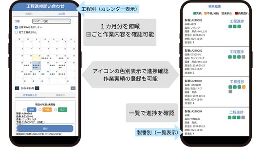カレンダー形式の「工程別」、一覧形式の「製番別」のいずれかを選んで、進捗状況を確認できます。