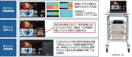 - スムーズな動画編集: 記録システムの端末から編集用の端末へ簡単にデータ転送でき、専用の編集ソフトウェア「OPeDrive VE」を用いれば、手術動画の効率的な編集が可能に。