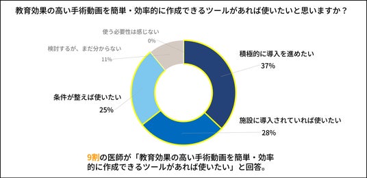 さらに、この現状に対して、「教育効果の高い手術動画を簡単・効率的に作成できるツールがあれば使いたいと思いますか?」と聞くと、9割の医師が「使いたい」と答えたことから、手術教育時間の確保に向けて手術動画の作成の効率化が一つの重要なカギといえるでしょう。