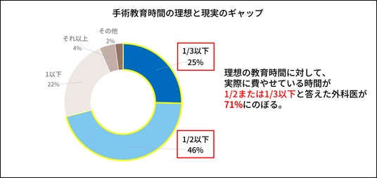 - 教育時間の不足が深刻:理想の教育時間に対して、実際に費やせている時間が1/2または1/3以下と答えた外科医が71%にものぼる。