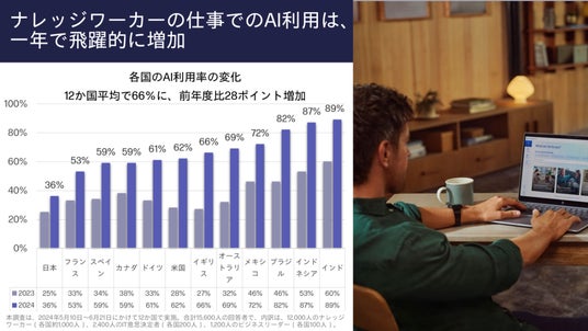 2024年、ナレッジワーカーのうち仕事においてAIを利用している人の割合は、グローバルでは前年の38%から66%に急増、日本も25%から36%に増加しました。