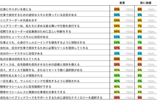 日本のナレッジワーカーは、仕事との健全な関係性を高める主要な6つの促進要因のうち、「リーダーシップ」と「スキル」に関する項目について、昨年よりも特に重要性を感じています。