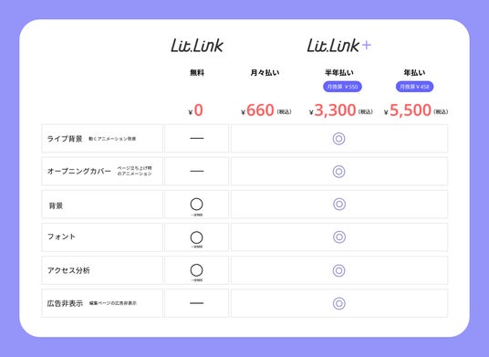 「リットリンクプラス」は、無料版の「lit.link」の機能に加えて、よりリッチなページが作成できる有料プランです。
