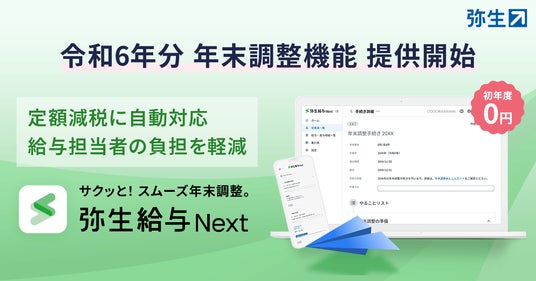弥生株式会社(本社:東京都千代田区、代表取締役 社長執行役員 :武藤健一郎、以下「弥生」)は、クラウド給与サービス「弥生給与 Next」の令和6年分年末調整機能を10月30日より提供開始しました。今回の年末調整機能は、定額減税への対応をはじめとした税制改正や各種申告手続きに対応し、より効率的な年末調整業務を実現します。