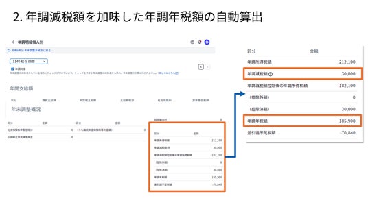 業務担当者入力用画面では、申告の内容を踏まえた、年調減税額の確認ができます。