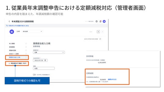 今回提供する年末調整機能では、定額減税を自動で計算し、従業員ごとの控除額を正確かつ迅速に反映します。各種控除申告書の提出については、スマートフォン等で回収・修正ができるWeb申告機能に加え、今回新たに紙での申告書提出にも対応しました。これによりWeb申告が難しい従業員は紙の申告書で提出することができるようになり、Webと紙を併用した、全従業員に向けた柔軟なワークフローを実現しました。さらに、各従業員からの申告書は、国税庁様式での出力が可能なため、見慣れた形式で確認できる利便性も向上します。