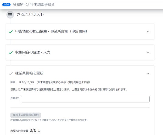「やることリスト」機能は、給与業務・年末調整業務の進行状況を管理できる機能です。完了したタスクはチェックがつくため、進行状況を可視化できます。