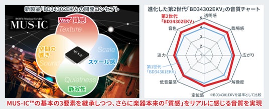 MUS-IC(TM)シリーズの第1世代オーディオDACチップ「BD34301EKV」は音質を高く評価され各社のフラッグシップモデルに採用されており、「BD34302EKV」はその第2世代品です。ロームDACチップの基本コンセプトである「自然でフラットな音」を継承しつつ、MUS-IC(TM)シリーズの「空間の響き」「静寂性」「スケール感」の3要素に加え、新製品は楽器の音の「質感」をリアルに表現することを目指しました。