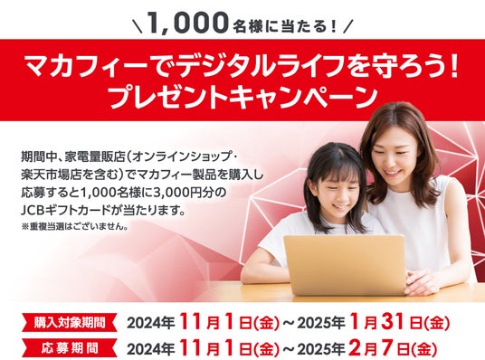オンラインのセキュリティ対策製品を提供しているマカフィー株式会社(本社:東京都千代田区)は、2024年11月1日(金)から2025年1月31日(金)の期間中、家電量販店(オンラインショップ・楽天市場店を含む)でマカフィー製品を購入し応募すると抽選で1,000名様に3,000円分のJCBギフトカードが当たる「マカフィーでデジタルライフを守ろう!」キャンペーンを開催いたします。