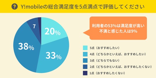 ・Y!mobile利用者の53%は満足度が高い。不満に感じている方の割合は9%
