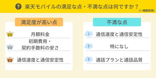 楽天モバイルを利用している方を対象に、利用して満足度が高かった点と、不満に感じた点を調査しました。