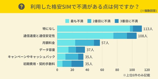 格安SIMを利用して不満だった点を、不満度順に最大3つまで答えていただきました。その結果、回答数が多かった項目は「特になし」で、113人が選びました。