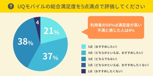 ・UQモバイル利用者の58%は満足度が高い。不満に感じている方の割合は4%