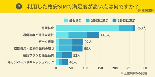格安SIMを利用して満足だった点を、満足度順に最大3つまで答えていただきました。その結果、回答数が多かった項目は「月額料金」で、260人が選びました。
