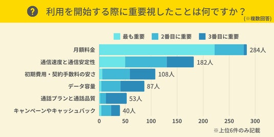 格安SIMを利用する際に、ユーザーが重要視する点を、重要度順に3つ答えていただきました。その結果、回答数が多かった項目は「月額料金」で、284人が選びました。