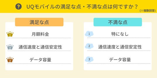 UQモバイルを利用している方を対象に、利用して満足度が高かった点と、不満に感じた点を調査しました。