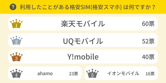 格安SIMで最も利用されているサービスは、楽天モバイルで、60票を獲得しました。次いで、UQモバイル(52票)、Y!mobile(40票)がランクインしています。