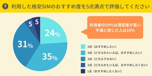 利用したことがある格安SIMに対して、満足度を5点満点で評価してもらいました。その結果、4点以上の回答した割合は59%。一方、2点以下の回答をした割合は10%でした。