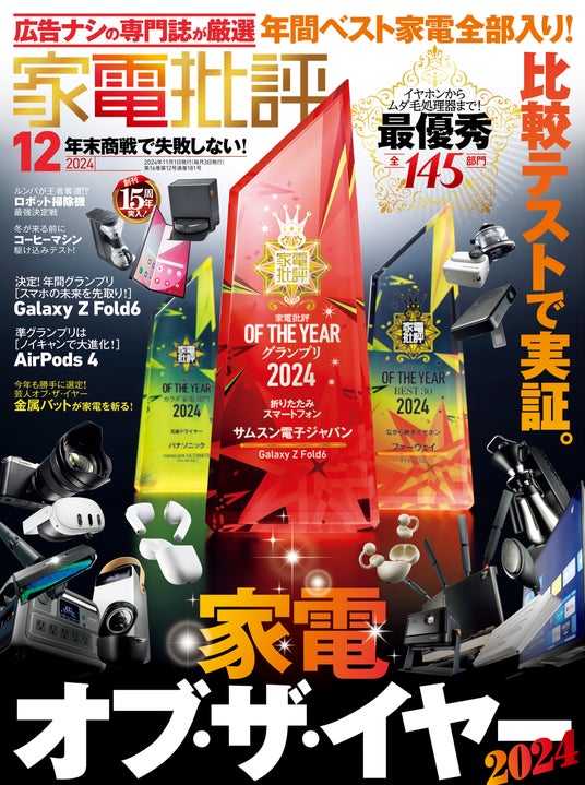 家電批評12月号は、1年間の総まとめ「家電オブ・ザ・イヤー」を総力特集! ハイエンドイヤホン・カラダ家電・映像機器など、テストしてわかった“良いモノ”をまるっと集めてお伝えします。他にも、ホットが恋しい季節におすすめの「コーヒーメーカー格付け」や、勝手に芸人オブ・ザ・イヤー2024に選出した「金属バッドインタビュー」など、生活が豊かになる家電情報も満載。本リリースでは、商品テストに基づくベストバイ製品の一部をご紹介します。
