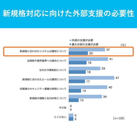 - ISMS新規格対応に向けて外部支援が最も必要だと感じることの上位は「新規格に合わせたシステムの選定」「法規制や業界基準への適合」「社内の予算制約」