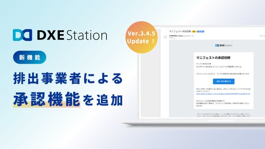 DXE株式会社(所在:東京都中央区、代表取締役:小山 逸朗)は、産業廃棄物処理業務の効率化サービス『DXE Station』をVer.3.4.5へアップデートし、電子マニフェストの本登録において、排出事業者による承認機能をリリースしたことをお知らせします。